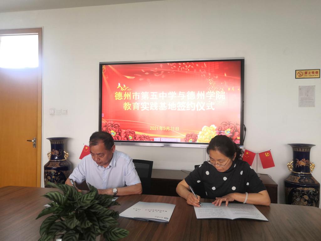 2021 年 5月 31 日上午,数学与大数据学院赴德州市第五中学举行“德州学院教育实践基地”和“德州学院就业基地”签约揭牌仪式。数学与大数据学院院长徐凤生、副书记左海静、副院长刘艳芹,数学与应用数学专业系主任孔淑霞、副主任尹秀玲,辅导员郑晓杰、刘珺一行与德州市第五中学的领导老师参与签约仪式。