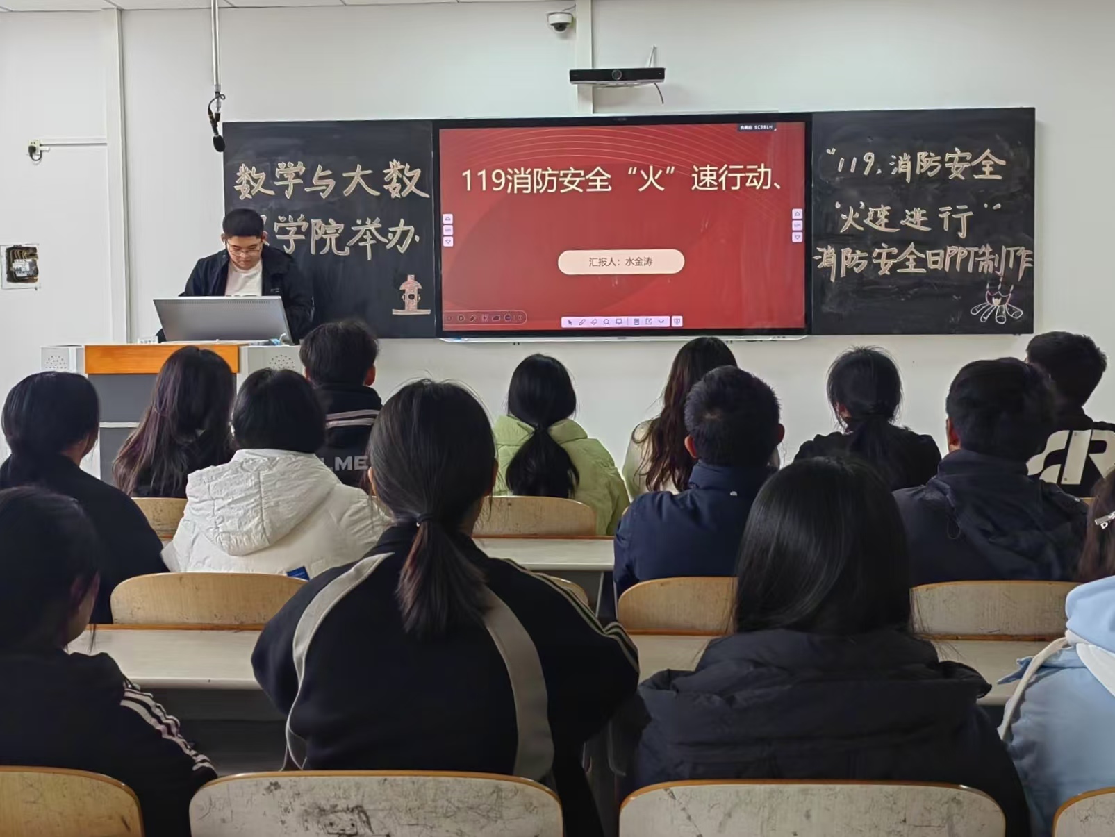 为提高学生的消防安全意识,进一步加强同学们对消防安全知识和技能的巩固。数学与大数据学院于11月9日在求真楼303举办“119,消防安全‘火’速行动”消防安全日PPT制作活动。