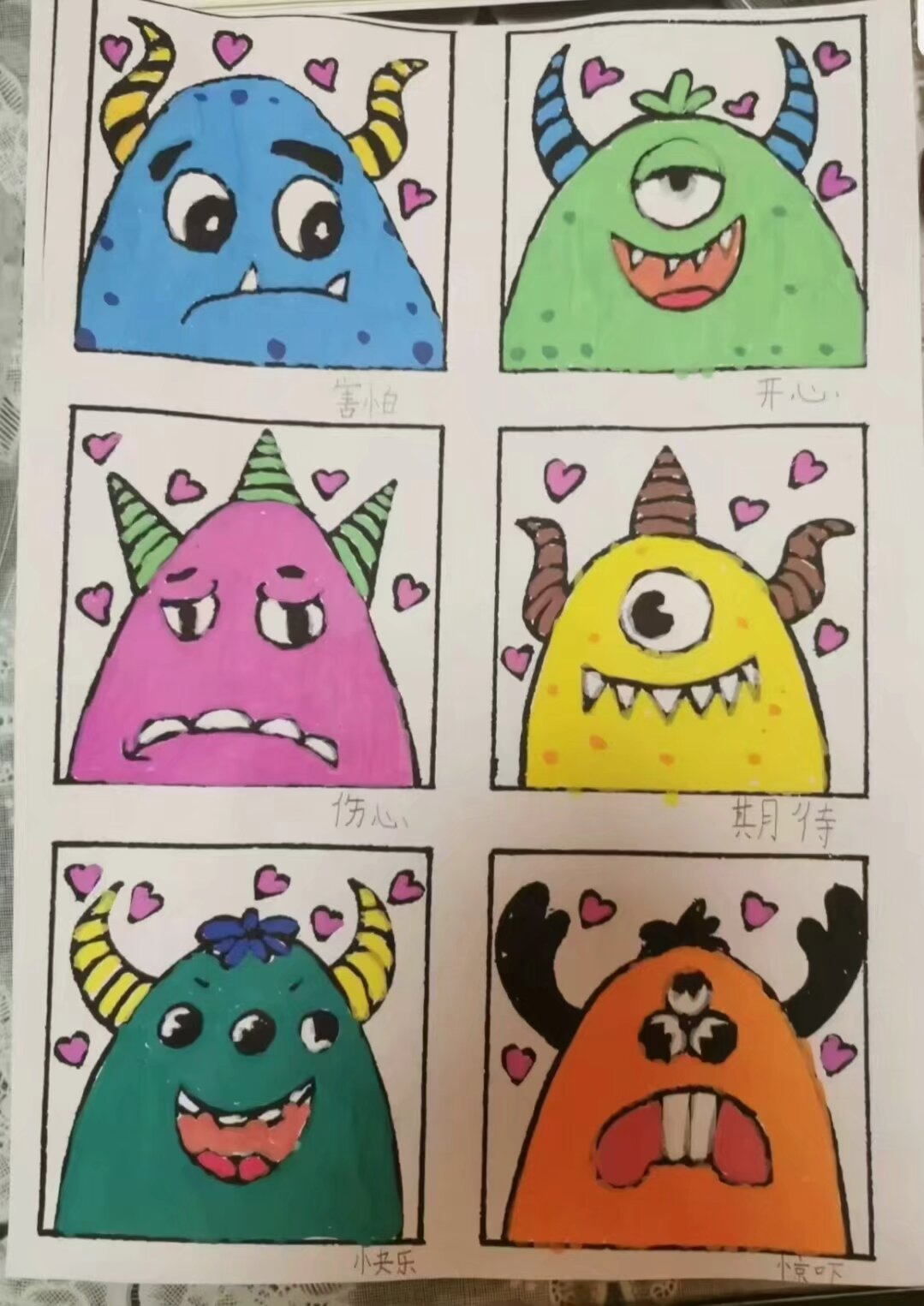 在活动筹备阶段,学生们回顾近期生活,在A4纸上绘制九宫格,挑选9种不同情绪填写在方格内,并用不同的颜色和方式绘制出精美的图画。从九宫格的划分思路,到情绪类型的选择,再到画面元素设计、色彩运用逻辑以及背后的故事,一幅幅作品充分展现了同学们丰富多彩的内心世界。