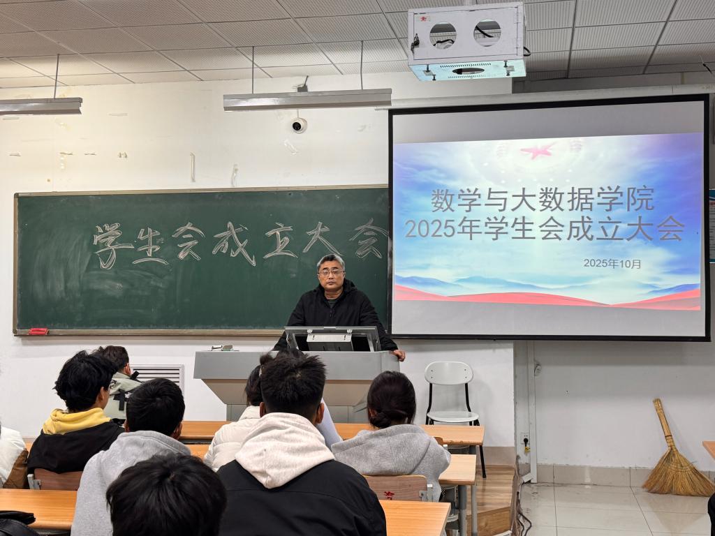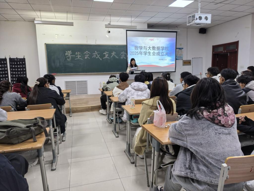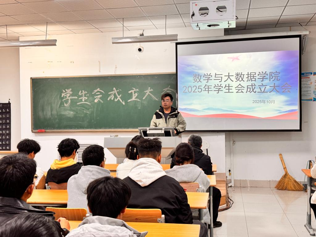 为进一步加强学生组织建设,提升学生综合素质,搭建师生沟通的桥梁,促进学院文化建设与和谐发展,数学与大数据学院于10月21日在明理楼0255组织召开2025年学生会成立大会。学院党委副书记陈志国,辅导员王冰新、郭振将、张茜,全体学生会成员参会。