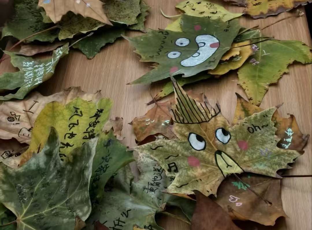 此次心理活动以落叶为载体搭建心灵舞台,借创作传递自我心声。在活动中,同学们在捡拾的落叶上以油漆笔、针管笔等工具自由创作写下鼓励自己的短诗,绘出代表心情的图案,让内心的情感在自然之美中真诚流露。最终呈现的“叶上作品”丰富多样,展现出同学们在探寻内心丰盈、感受生活精彩时的敏锐洞察与创作热忱。