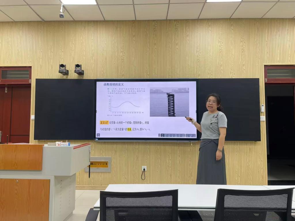 活动伊始,刘磊老师围绕高等数学函数连续定义展开教学。她以 “德州凌晨气温变化曲线” 为引,将这一学生熟悉的生活现象融入课堂,引导学生直观感受 “连续” 的概念。教学过程中,刘磊老师采用板书推演与多媒体动态演示相结合的方式,将晦涩的 ε–δ 定义转化为可视化知识。通过动态演示 “任意小” 与 “足够小” 的对应关系,她带领学生深入剖析极限与连续的内在联系,逐步揭示 “极限是连续的基石,连续是极限的特例” 这一核心逻辑。