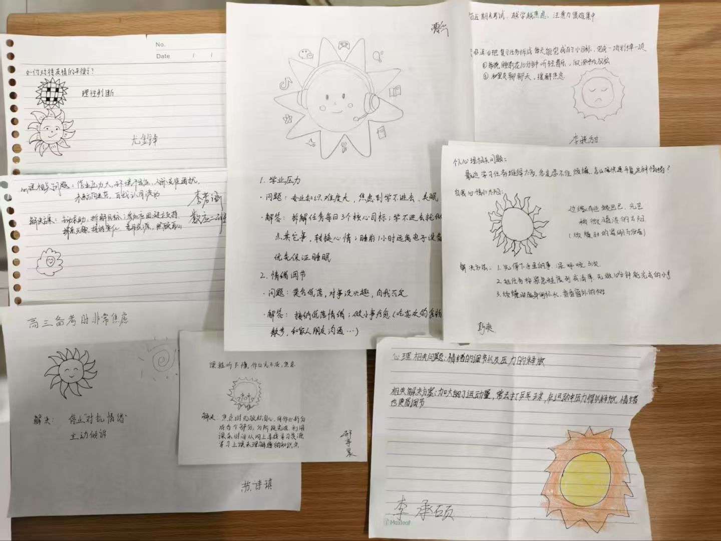 活动伊始,参与者们手持空白小纸条,认真写下情绪调节、压力缓解等相关心理问题,并绘制属于自己的心情小太阳,同时标注出应对问题的解决方法。在分享环节,大家依次讲述自身心理困扰的发生与化解经历,解读心情小太阳的形象寓意,在坦诚交流中传递正视心理需求的重要性,将个人调节情绪的经验分享给在场同学。