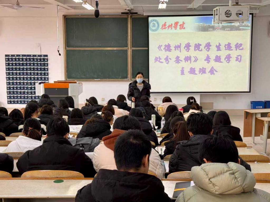 为深入贯彻学生管理法治化、规范化要求,强化学生纪律意识,明确行为边界,数学与大数据学院按照学生工作部统一部署,于近期组织召开《德州学院学生违纪处分条例》专题学习班会,各级辅导员深入班级开展系统宣讲。