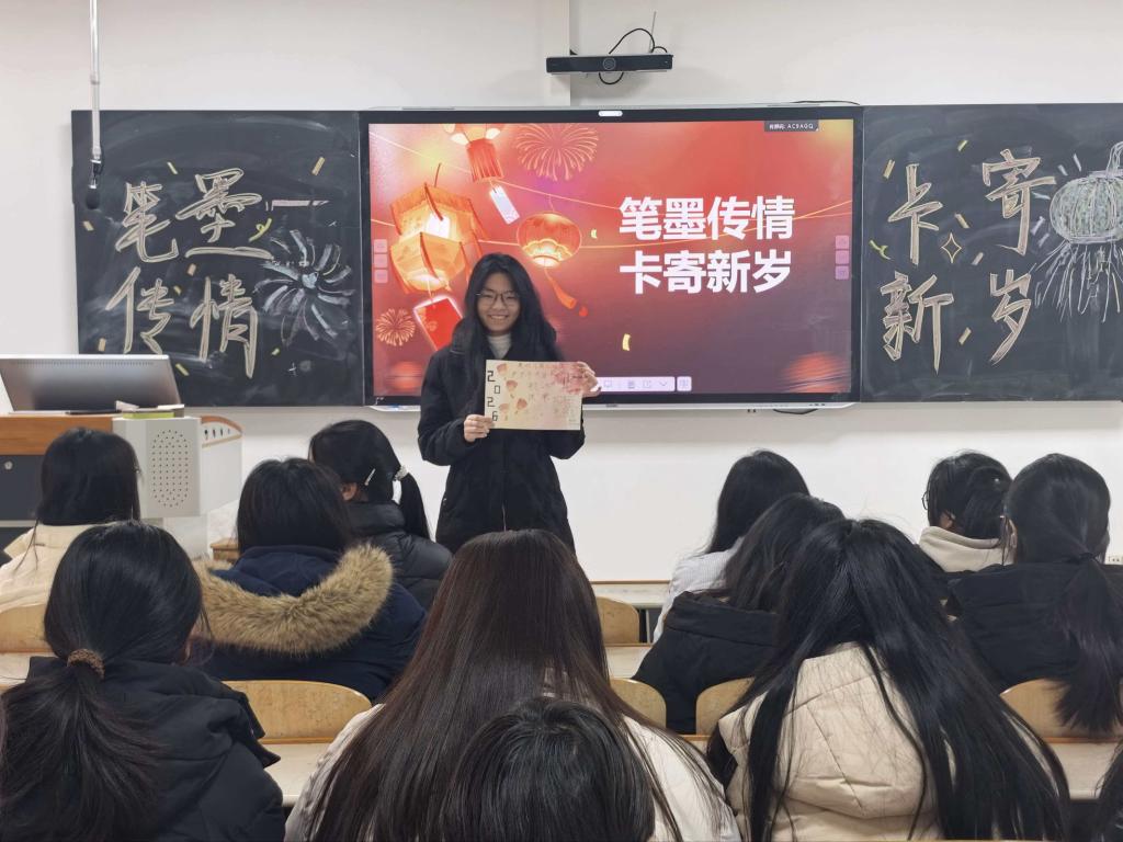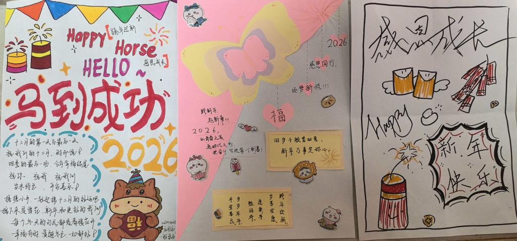 12月21日的“笔墨传情,卡寄新岁——跨年”手写贺卡活动中,同学们在A4卡纸上书写祝福、绘制图案,将感恩与期许融入一笔一画,在纸墨温情中提升了情感表达与审美创造能力,为新年的到来增添了真挚的人文温度。