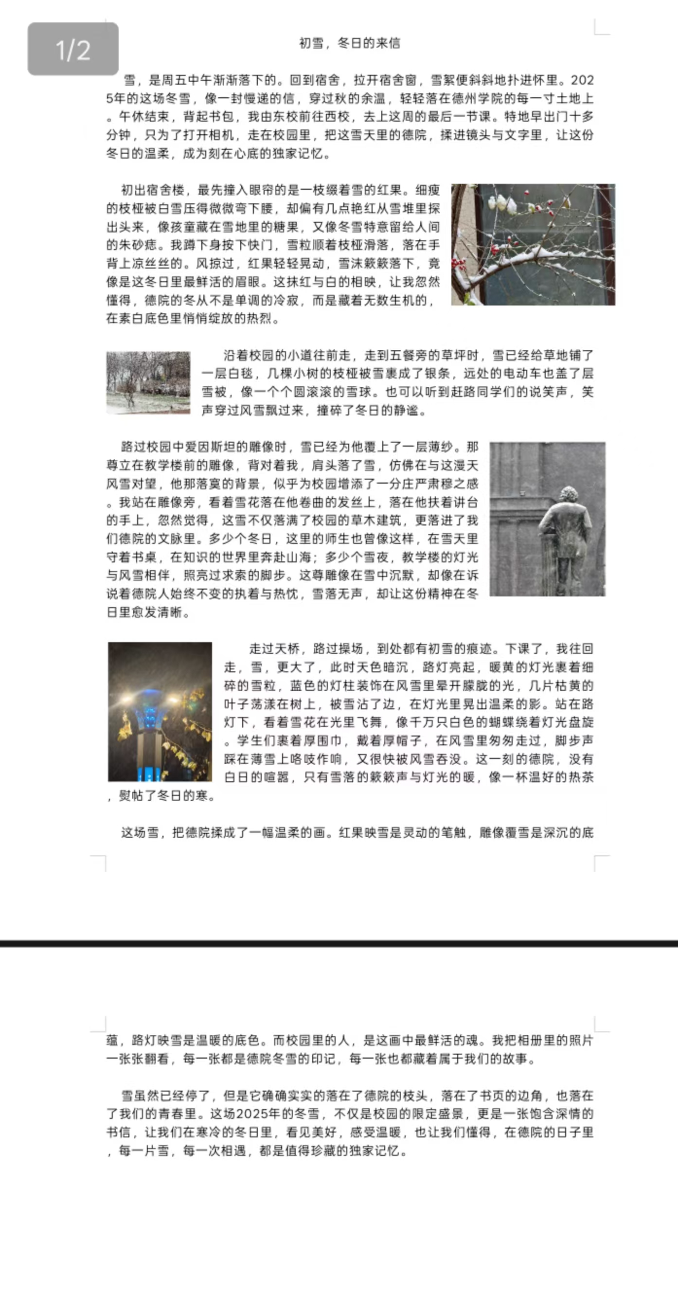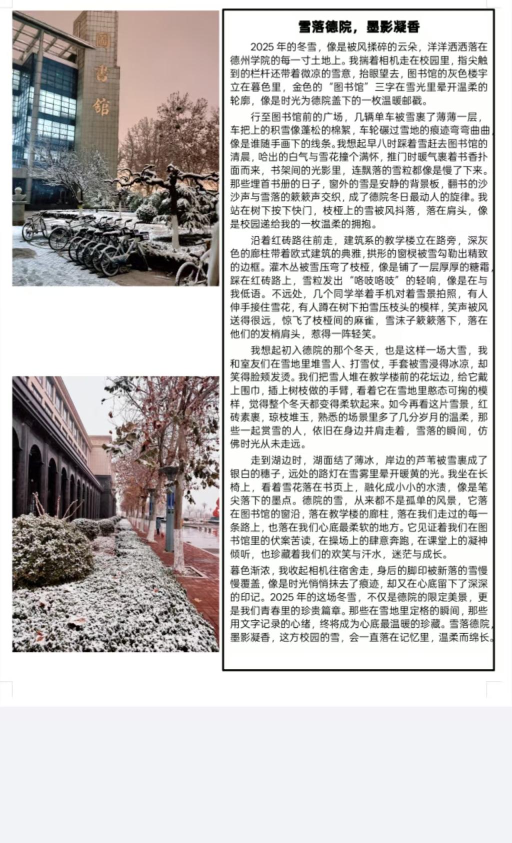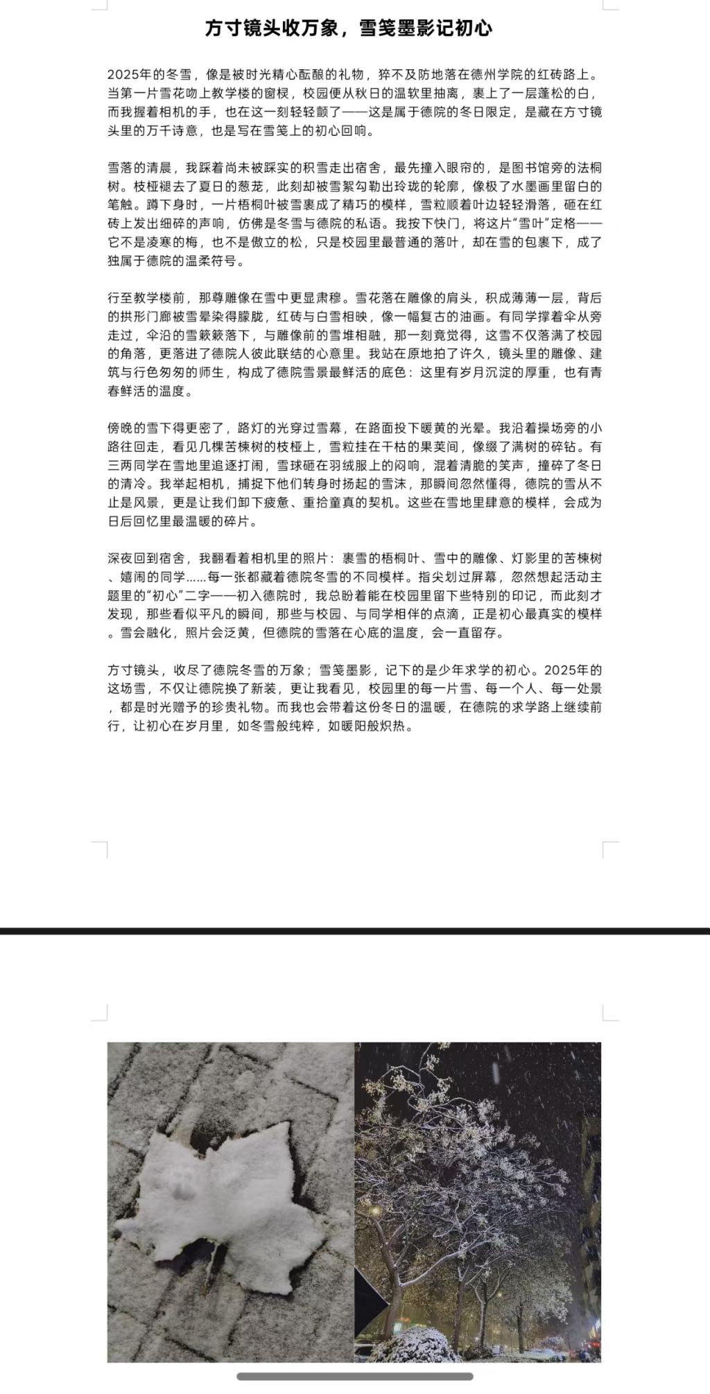 此次活动以校园雪景为核心,将生活观察与情感表达相结合,引导同学们主动关注校园环境与身边点滴。同学们带着对校园的热爱,用镜头捕捉雪后校园的真实场景,同时感受校园冬季的独特氛围,分享雪天里的校园体验与内心感受,在创作过程中深化对校园的情感认知。