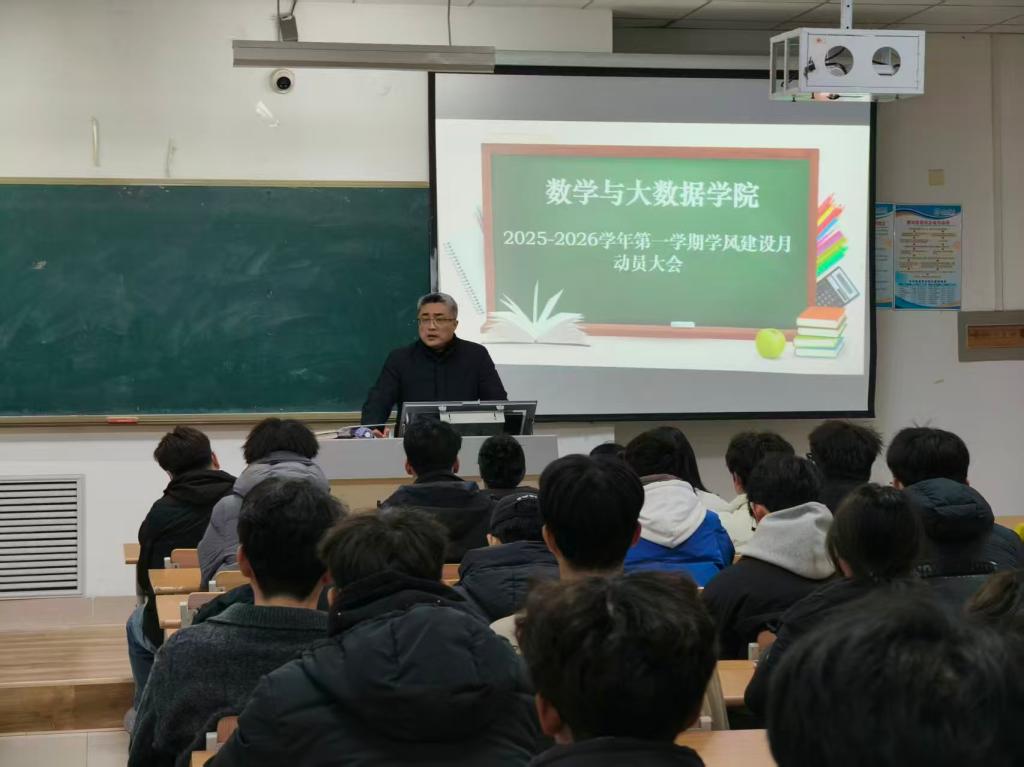 为进一步加强学院学风建设,营造诚信考试的良好氛围,筑牢学生诚信应考的思想根基,数学与大数据学院于12月30日在明理楼255教室召开学风建设月动员大会。副书记陈志国,全体辅导员以及学生会成员参会。