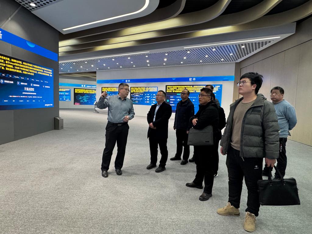在调研交流现场,企业负责人带领一行人实地参观技术展示区,详细介绍了数字商业、智慧城市、电子政务等核心业务与技术成果。随后的座谈中,双方围绕数字技术应用、人工智能实践等领域深入探讨,现场签署合作协议并共同为“就业基地”揭牌,为深化校企联动奠定坚实基础。