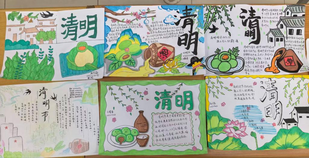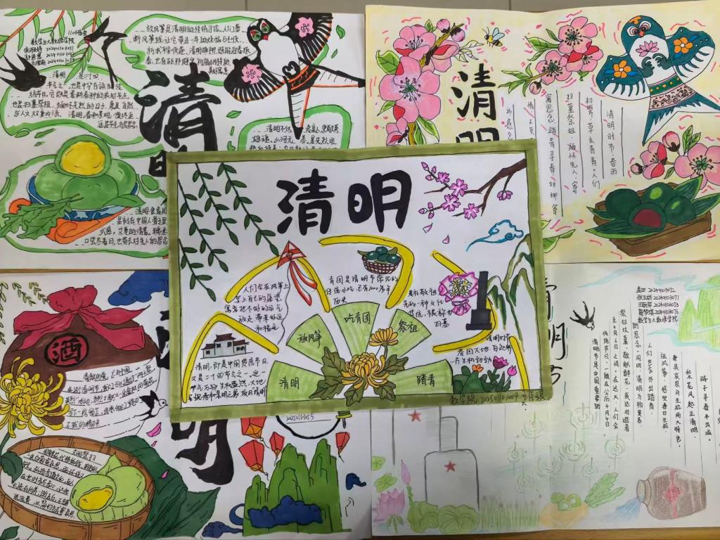 3月30日至4月2日的“墨绘清明意,笔承古今情”手抄报征集活动中,同学们围绕缅怀先烈、传统习俗、文明祭扫等主题进行手绘创作。作品版面整洁、图文并茂,既有祭扫场景与春日风物,又融入传统纹样与先贤形象,以艺术形式传递对文化根脉的珍视。